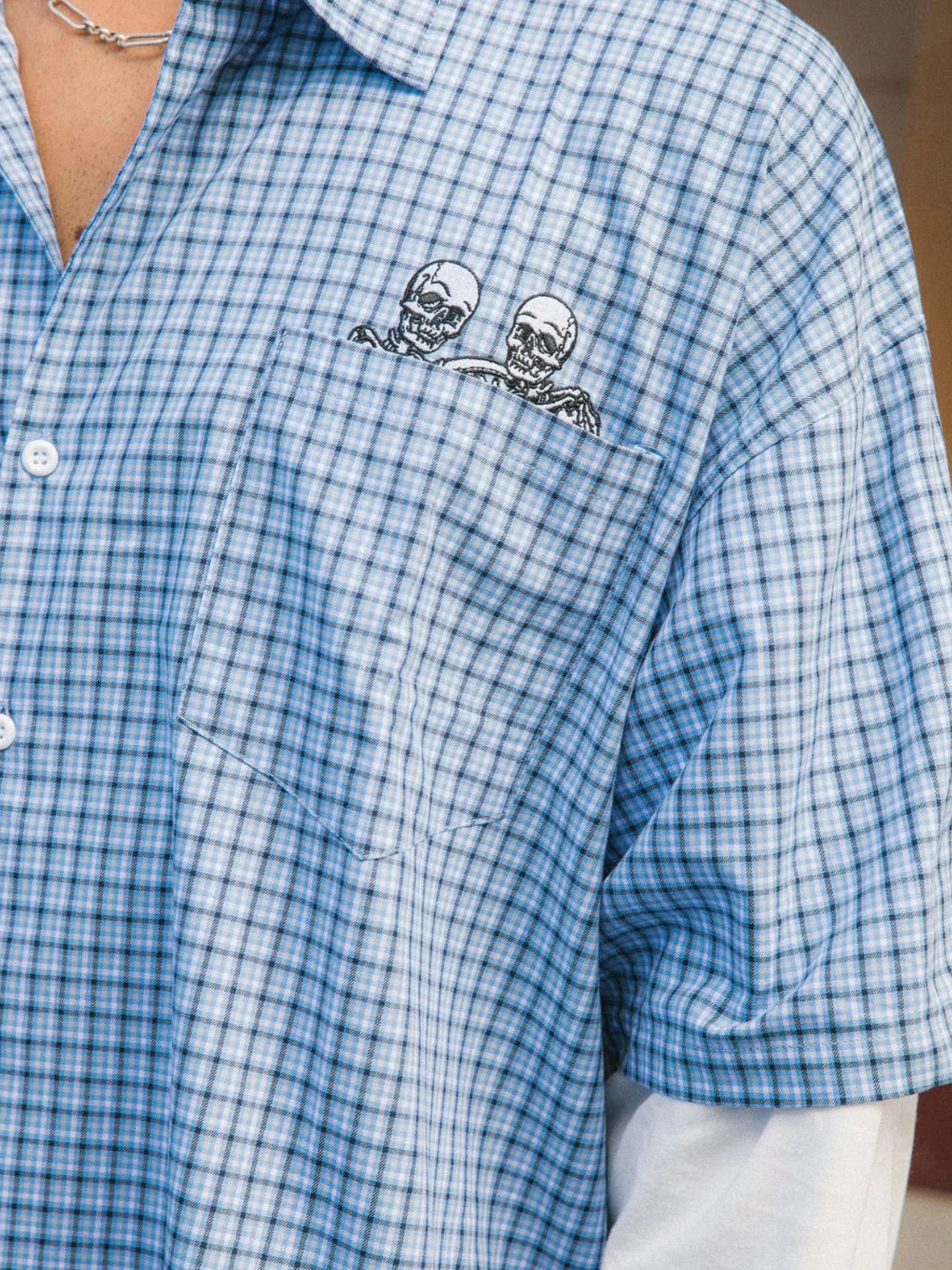 - Embroidered skeleton detail above pocket